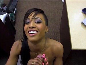 Una desesperada y bonita chica negra se masturba y se folla por algo de dinero. Mira a esta desesperada chica negra que está tratando de hacer un trato travieso con el dueño de la casa de empeño. Necesita dinero y está dispuesta a dar una mamada. Se desnu